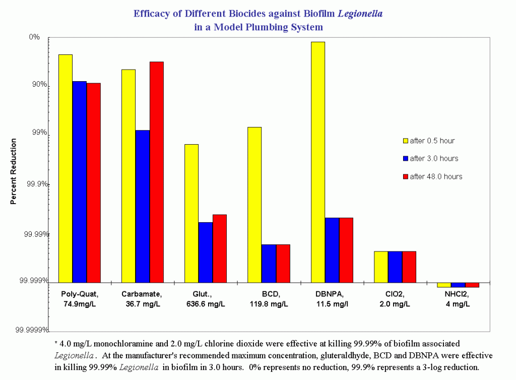 2001 yılında WHO (Dünya Sağlık Örgütü), CDC ve EPA (ABD Çevresel Önlemler Organizasyonu) tarafından, İsviçre’de yapılan toplantıda “ Su yoluyla bulaşan hastalıklar” konulu konferansta alınan kararlardan bir taneside; Kloraminlerin (Monokloramin) Legionella-özellikle biofilm içerisine etkinliği vurgulanarak-açısından klora göre daha etkili olduğunun belirtilmesidir.